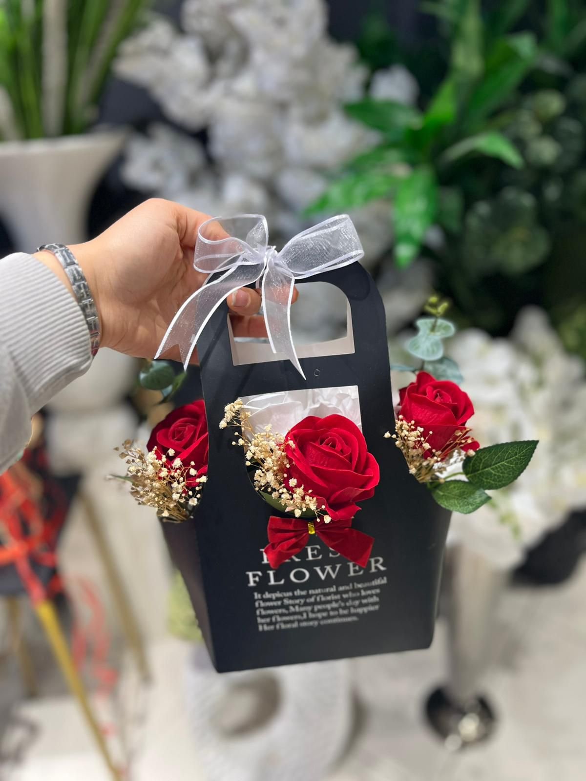 Taşınabilir çanta formu sayesinde hem estetik hem de kullanışlı bir hediye alternatifidir. Doğum günü, yıl dönümü ya da romantik bir sürpriz için zarif ve etkileyici bir seçimdir.