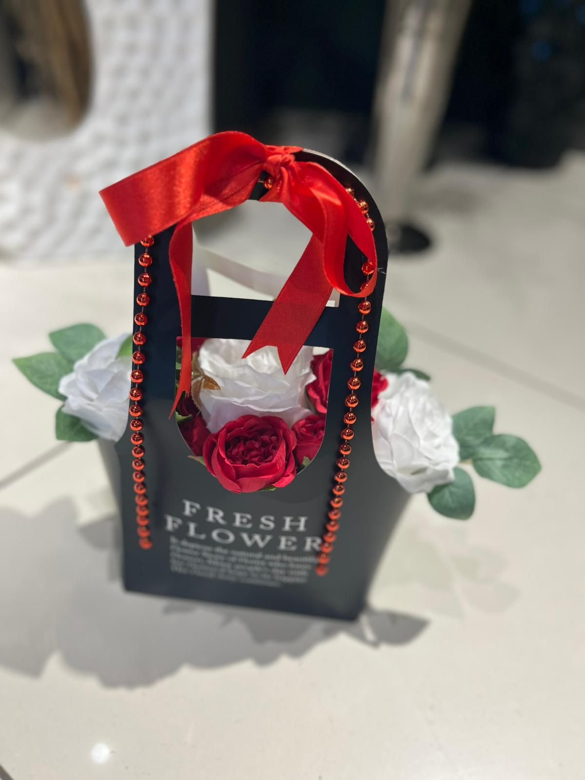 Modern ve şık tasarıma sahip özel siyah çanta kutu içerisinde hazırlanan bu aranjman, kırmızı ve beyaz güllerin zarif uyumunu taşır. Farklı kurdele ve aksesuar seçenekleriyle kişisel zevke göre tercih edilebilir.